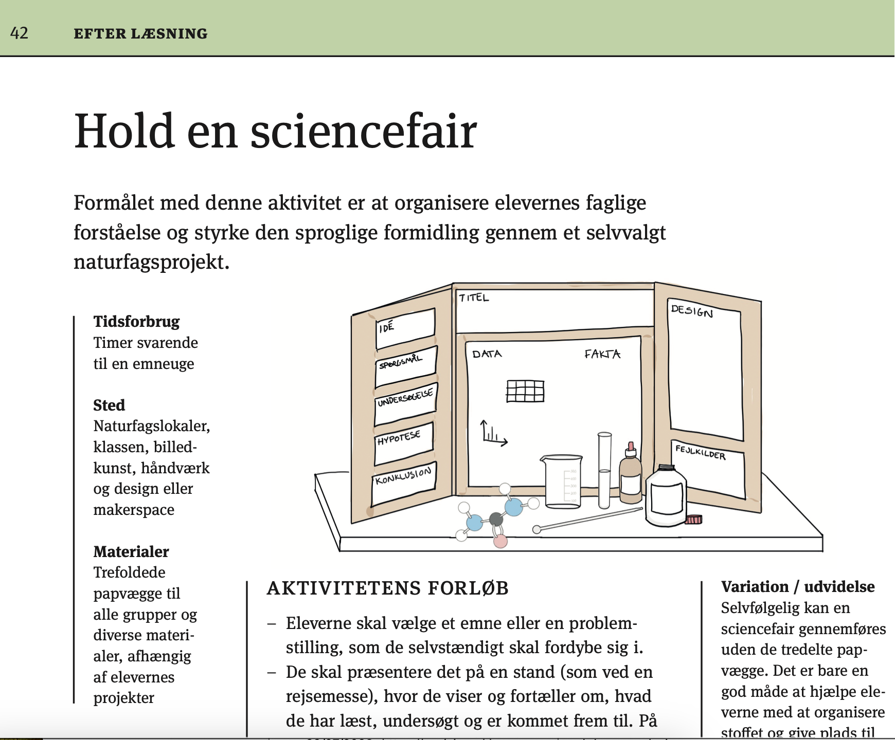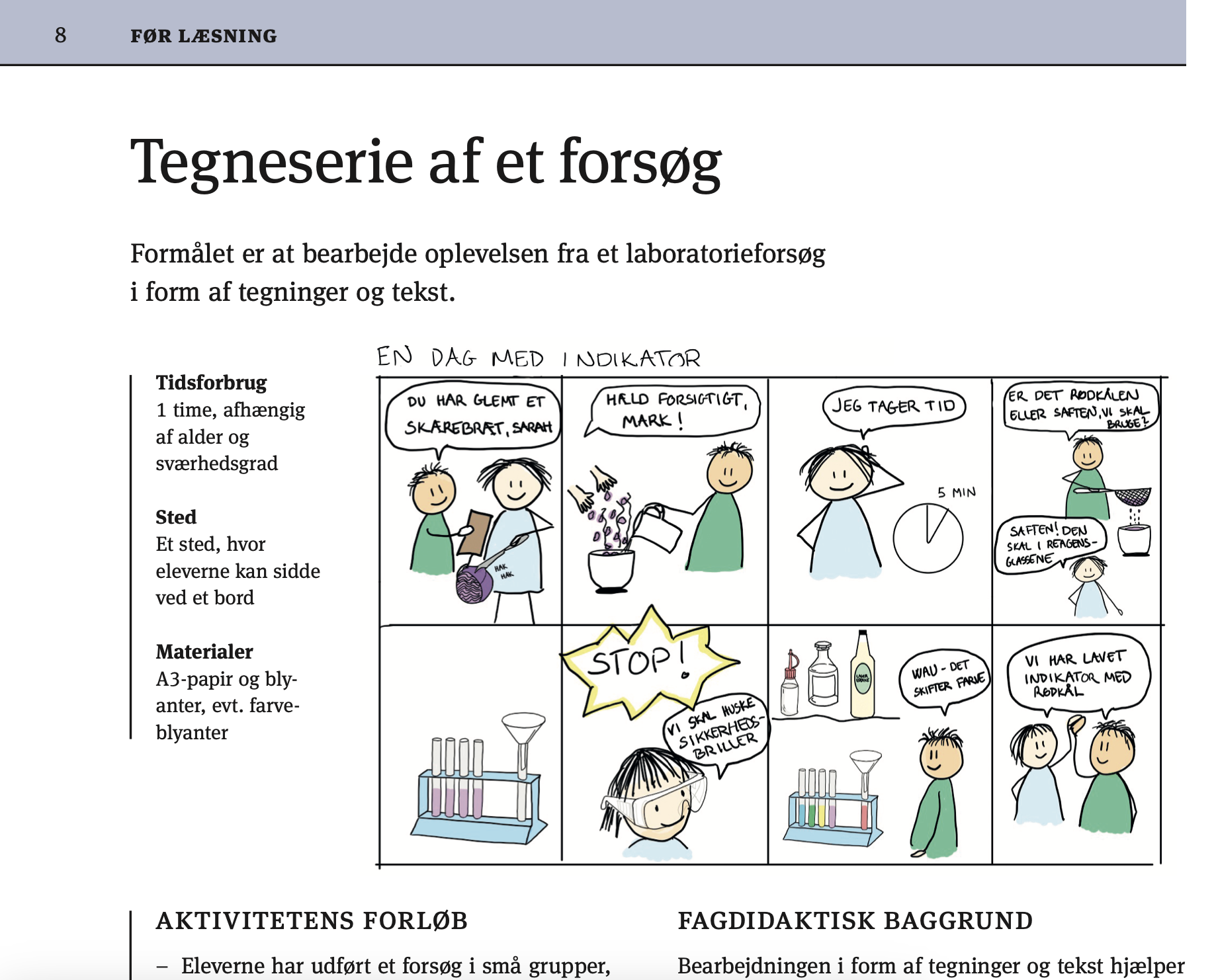 Hæftet indeholder 40 praktiske aktiviteter til undervisningen i naturfag i indskolingen, mellemtrin, udskoling og på alle niveauer. Alle aktiviteter lægger op til at styrke udbyttet af fagtekster. Det gælder både læsning, udvikling af fagsprog og fagbegreber. Aktiviteterne i hæftet er delt op i før, under og efter læsning af fagteksten og alle har et tydeligt formål, materiale, lokalitet og en fremgangsmåde for den praktiske udførelse. Derudover er der forslag til, hvordan aktiviteterne kan varieres og udvides.
